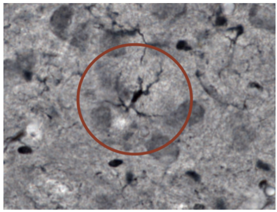 Du tittar på en silverinfärgning av hjärnstammen. Vilken celltyp är inringad?