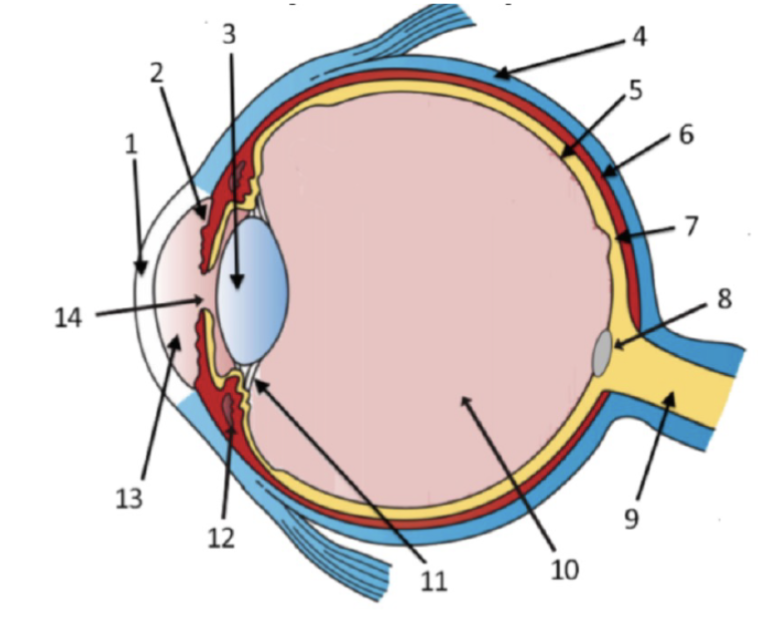 a) Vilken siffra pekar på gula fläcken? b) Vilken siffra pekar på choroidea?