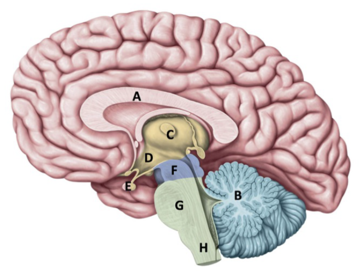 Vilken bokstav på denna bild sitter på Mesencephalon?