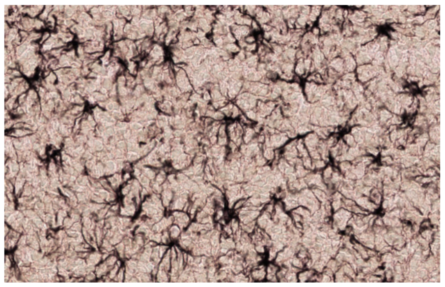 Vilka celler är specialfärgade i detta preparat från CNS? A: oligodendrocyter B: stjärnceller C: Astrocyter D: korgceller E: mikroglia C