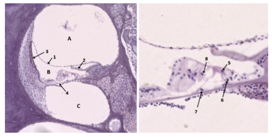 b) Vilken siffra markerar en “inre hårcell”? (1..8)