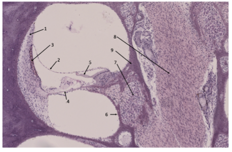 a) Vilken siffra pekar på strukturen som separerar scala media från scala vestibuli ? (1..9)
