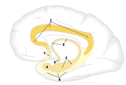 Lite svårare, vilken siffra i bilden ovan markerar a) gyrus cinguli b) amygdala? (0,5p för rätt svar, totalt 1p) a) 1 b) 4