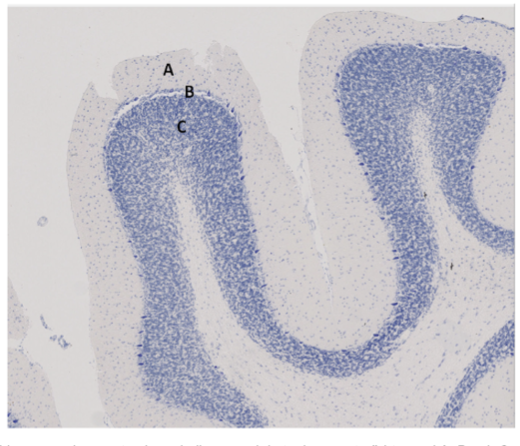 Bilden ovan visar cortex i cerebellum, med de tre lagren utmärkta med A, B och C.