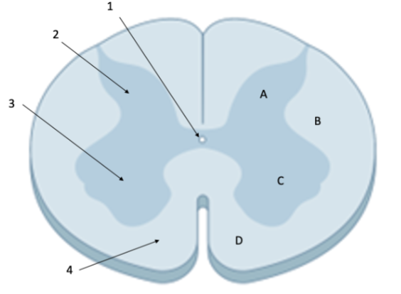 a) Vilket bokstav marker bakhornet? (A, B, C, D) b) Vilken siffra (pil) pekar på området där man finner motoriska neuron? (1…4) c) Vilken siffra (pil) pekar på ependymceller? (1…4)
