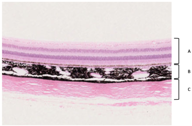 Ögat indelas i tre lager, och bilden visar dessa lager i den bakre delen av ögat (A-C).