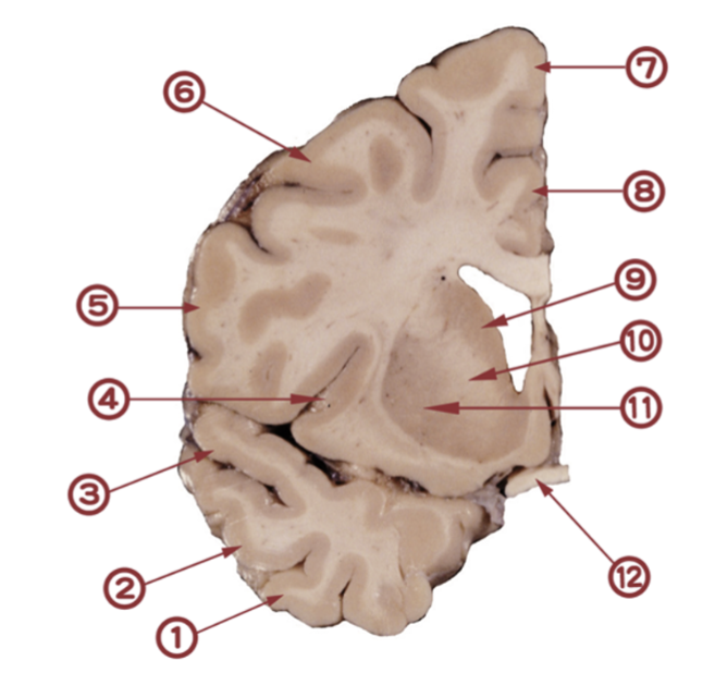 Den här är lite svårare, det är korrekt. Titta och klura, vilken siffra markerar nucleus lentiformis? (1p) TODO