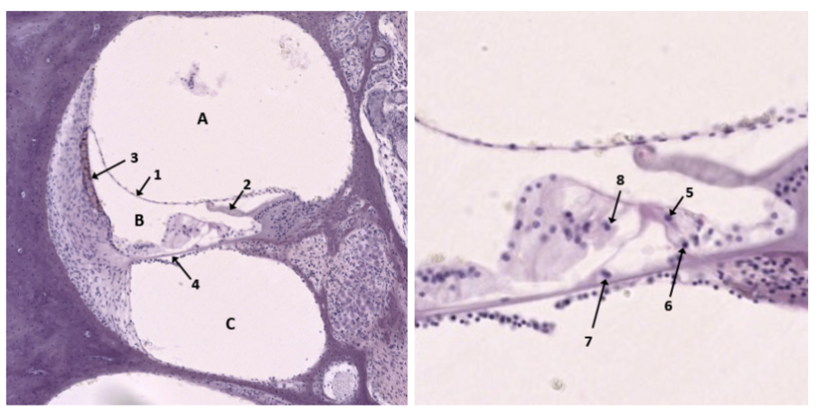 Vilken bokstav markerar scala vestibuli? Vilken siffra markerar tektorialmembranet? Vilken siffra markerar området som aktivt pumpar K -joner tillbaka till endolymfan?