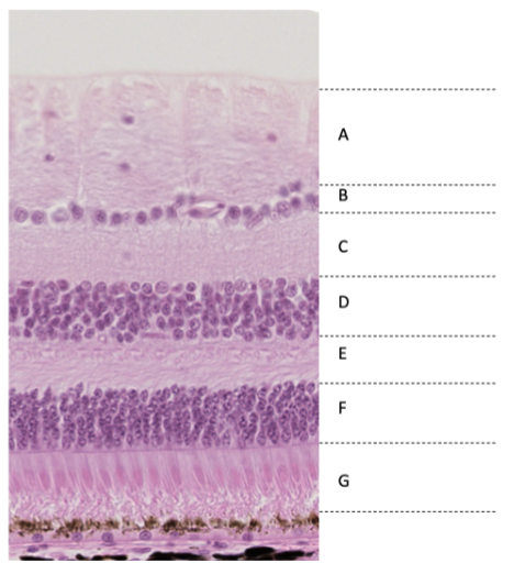 Bilden ovan visar en del av retina. Svara på följande frågor genom att ange rätt bokstav: