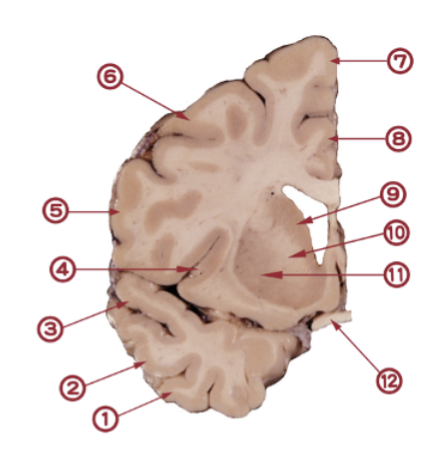 Den här är lite svår, vilken siffra markerar nucleus caudatus? (1p) 9 här.