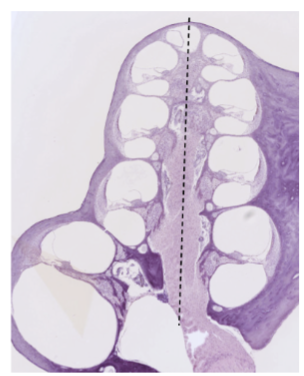 Bilden ovan visar ett tvärsnitt av cochlean med helicotrema upp. Tänk dig att du rör dig från centrum av cochlean (streckade linjen) och ut mot sidan (höger eller vänster): I vilken ordning möter du då nedan celler/strukturer?