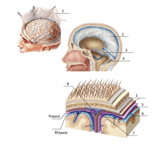 Vilken av dessa siffror markerar det meningeala bladet av dura mater? (1p)