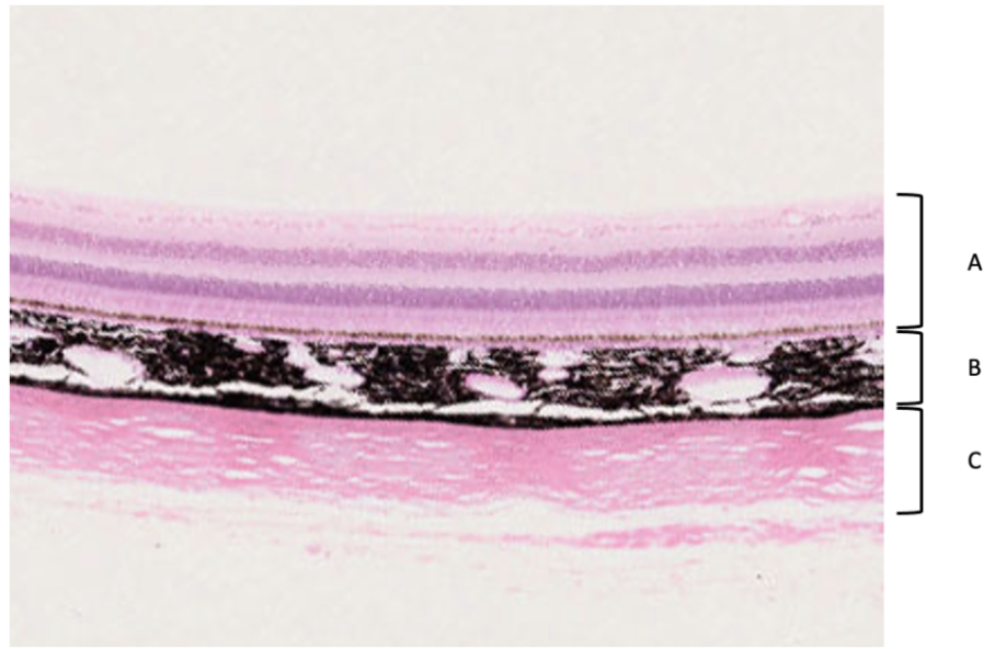 Ögat indelas i tre lager, och bilden visar dessa lager i den bakre delen av ögat (A-C).