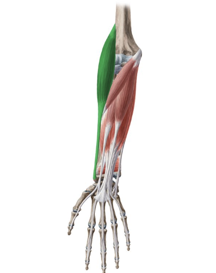 Ursprung Crista supracondylaris lateralis - humerus Fäste Processus styloideus - radius Funktion Armbågsflexion, särskilt i neutral pronation/supination Innervation n. radialis Relaterat armbågsled