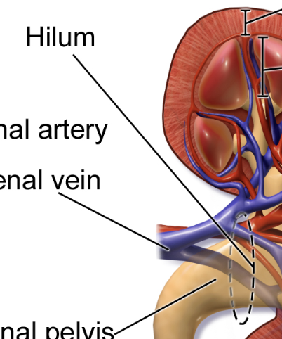 - Leder in till sinus renalis som innehåller fett, kärl och calyces.