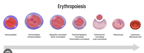 - Mognad av erytrocyter från proerytroblast till retikulocyt → erytrocyt; stimuleras av EPO.