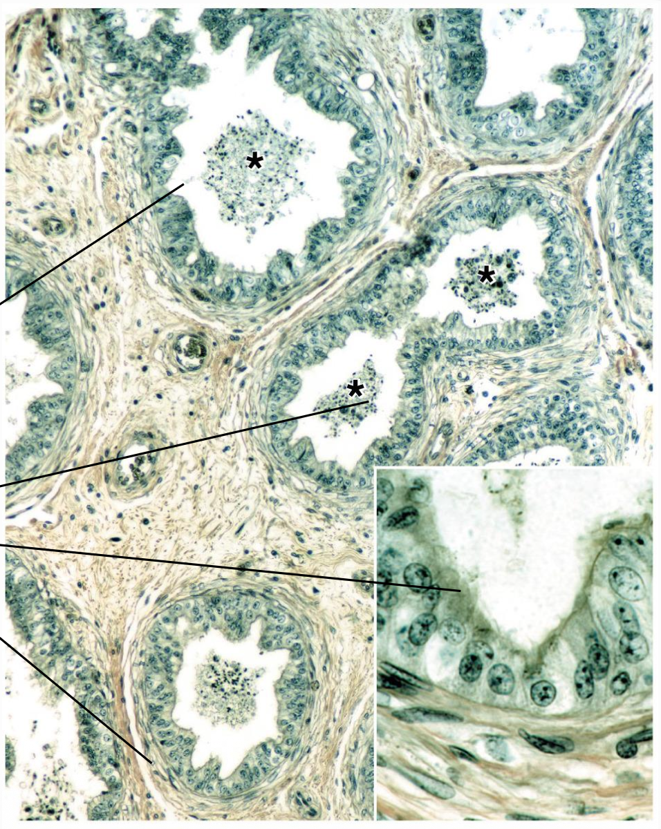 - Histologiskt kännetecken: fläckvis kluster av celler i lumen representerar aggregerade spermier (stjärnmarkerade i bild).