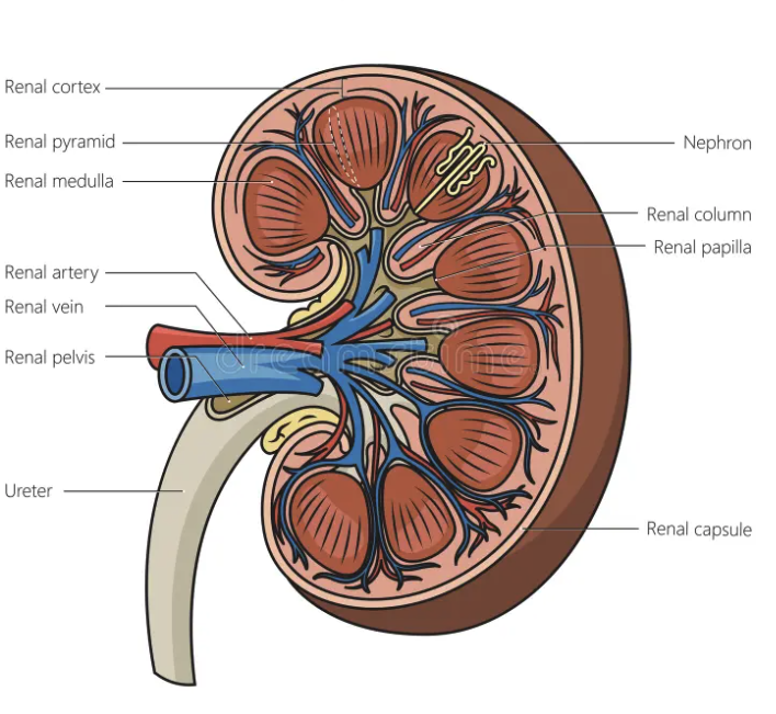 - Nefron: glomerulus med Bowmans kapsel, podocyter och blodfiltrationsbarriären