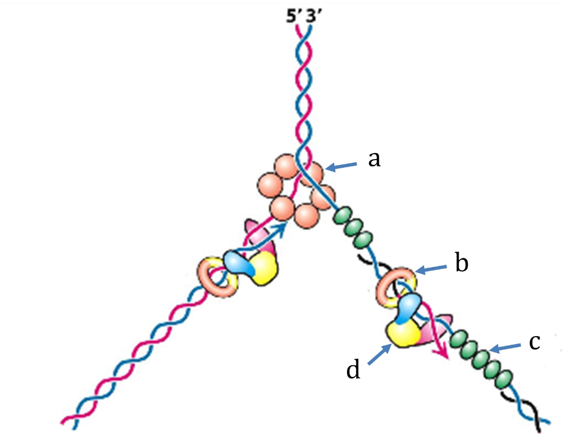På bilden syns en eukaryot replikationsgaffel. Fyra olika replikationsfaktorer är markerade på denna bild. Vad heter de olika faktorerna vid pil a, b, c och d? (4p)