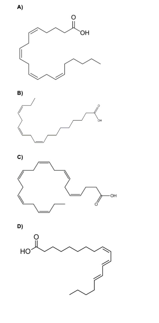 Fråga 4 Vilken/vilka av dessa är en omega-3 fettsyra? (1p) Välj ett eller flera alternativ: A: B B: C C: A D: D Rätt svar A B