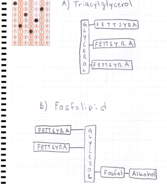 Besvarades på separat papper (triacylglycerol respektive fosfolipid).