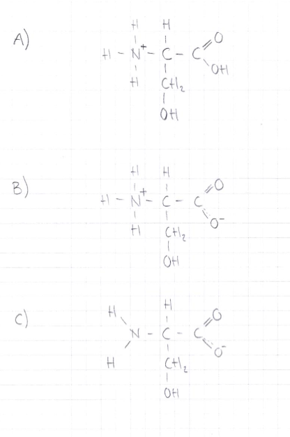 B) Vid neutralt pH kommer aminosyran vara en zwitterjon, dvs ha både en positiv och en negativ laddning men ingen nettoladdning.