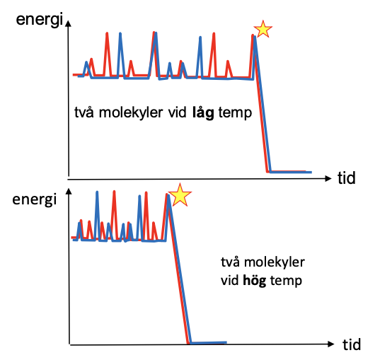 - det höjer sannolikheten att molekylerna krockar med varandra eftersom det krävs mindre energi för att det ska ske