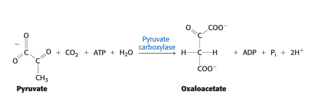 - Bildning av oxalacetat: pyruvat + -biotin-enzym ⇌ oxalacetat + biotin-enzym