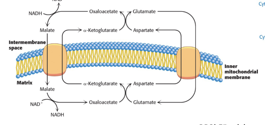 Shunt = transport under samtidig omvandling. Oxalacetat kan inte passera mitokondriemembranet direkt, så det reduceras till malat i matrix och oxideras tillbaka i cytosolen. Samtidigt flyttas ett NADH.
