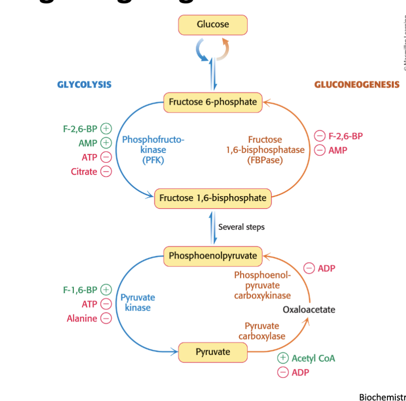 - Alanin (pyruvatkälla) och AMP signalerar låg energi → hämmar glukoneogenes.