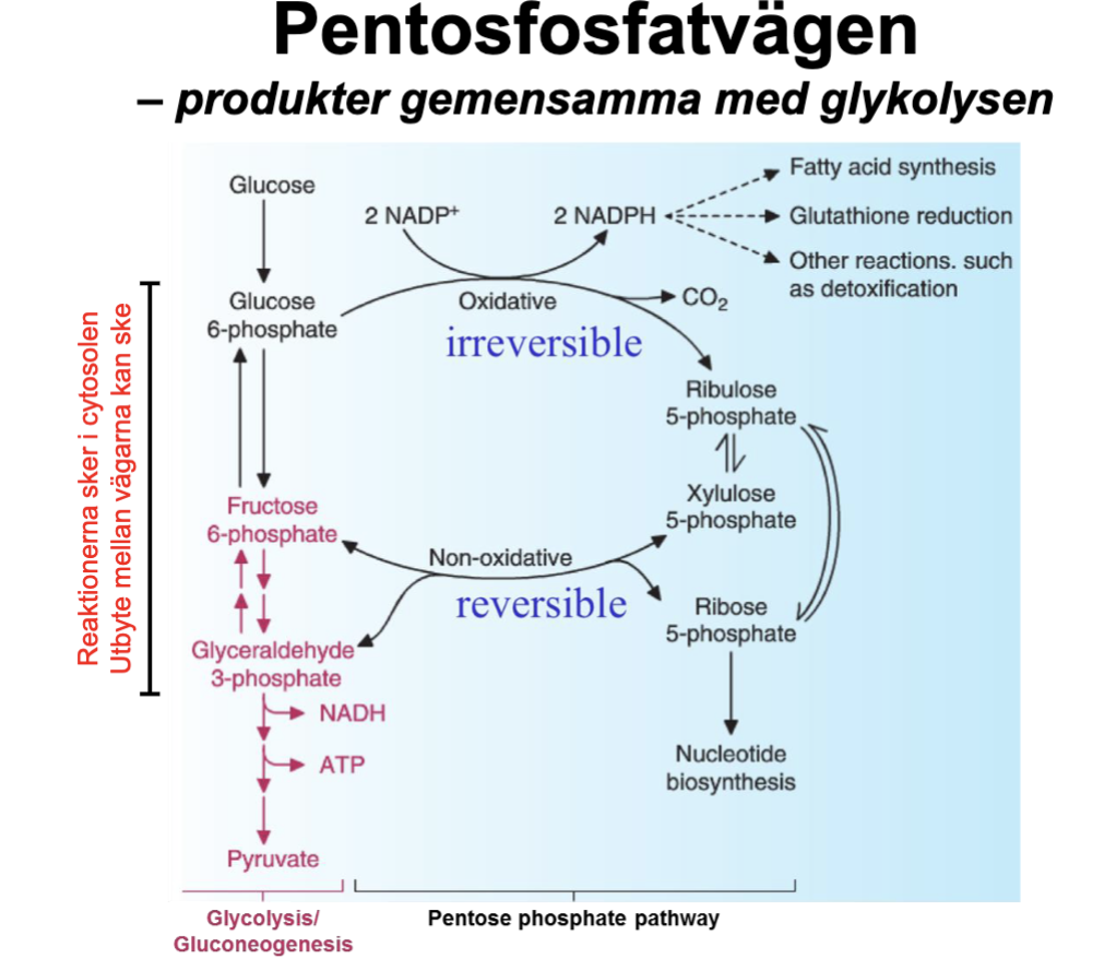 - IntermediÀrer kan slussas mellan pentosfosfatvÀgen och glykolysen (cellens behov av NADPH/ribos-5-fosfat/ATP avgör)